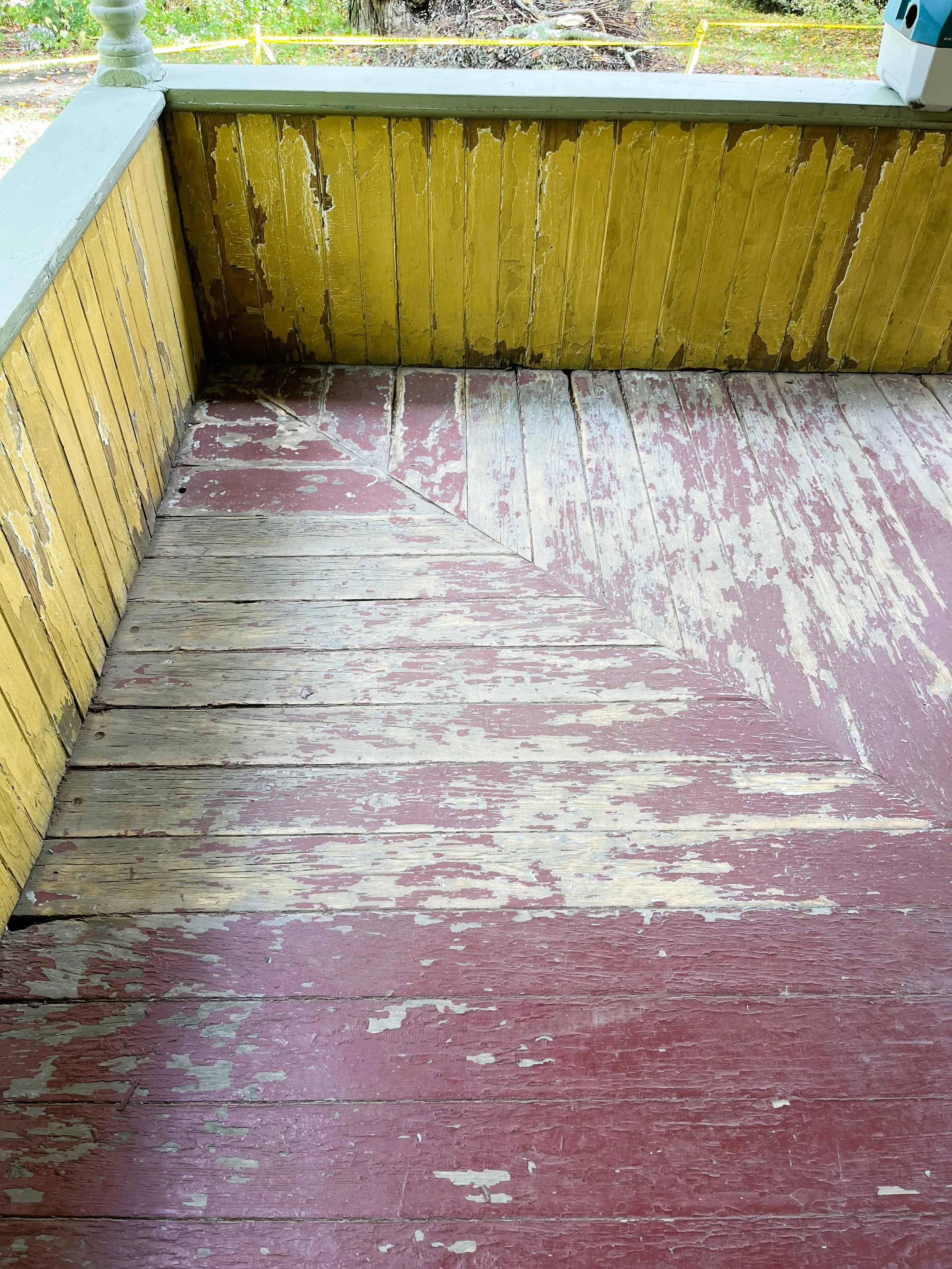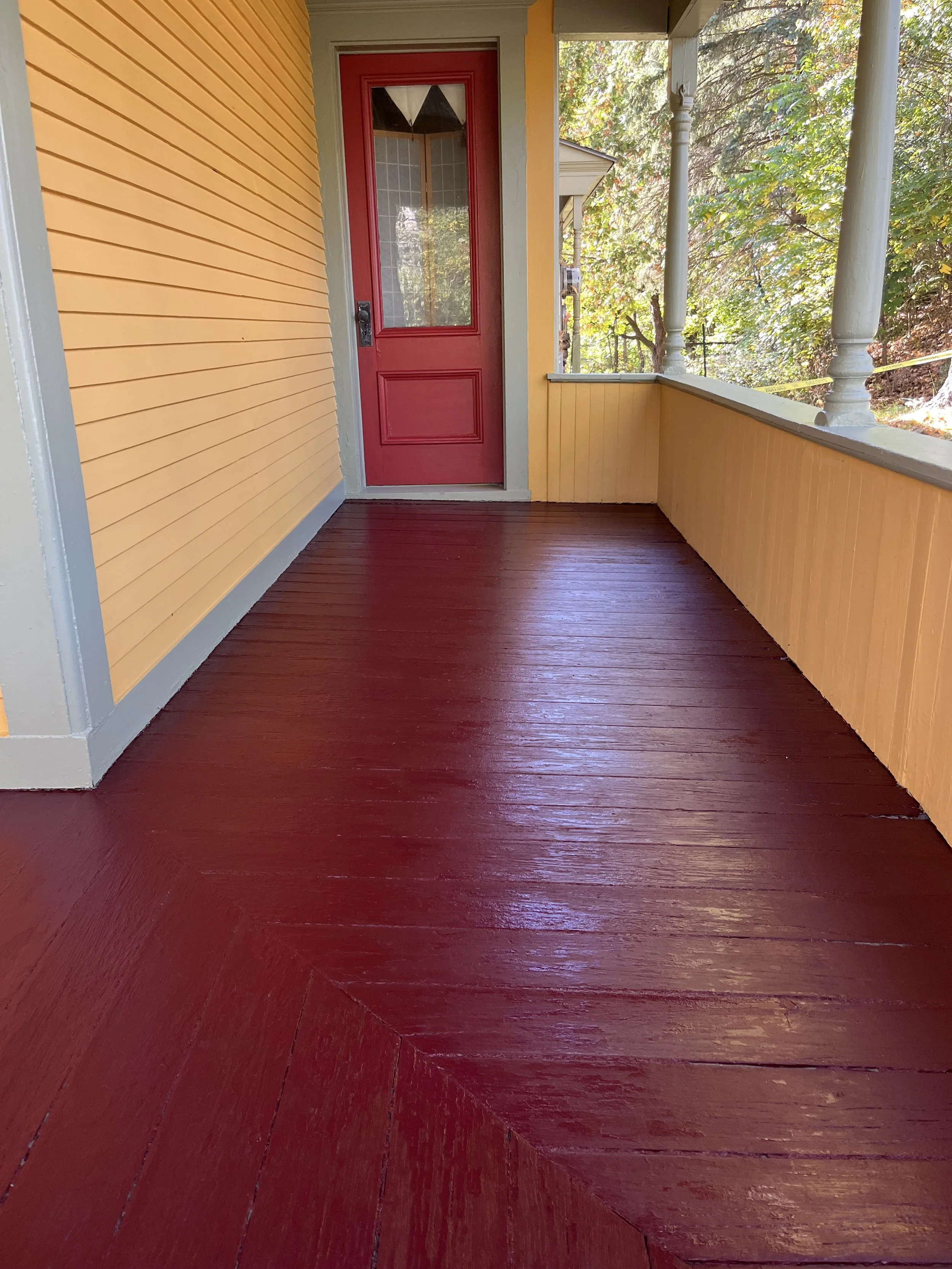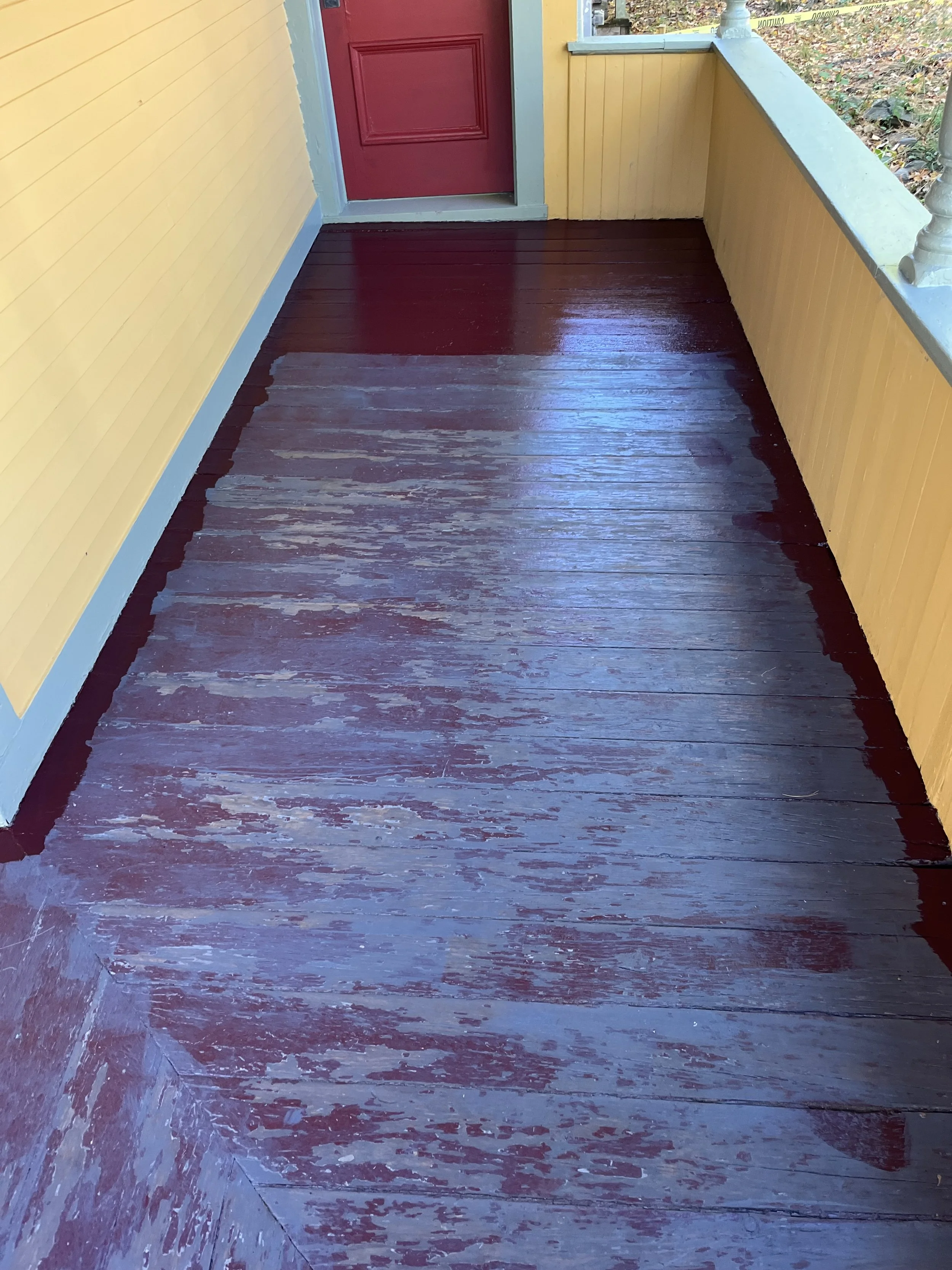 New Life Crew is always taking on new painting and renovation projects. One of our most recent 2025 projects involved painting and restoring an older home in Hinesburg. This snapshot into the work highlights renovation and painting of a porch. The paint on the porch was very old, cracked and rundown so needed extensive scraping and sanding to prepare for painting. Next we applied a special version of Mad Dog primer paint for decks that insulates the wood from exposure to the elements. After this the final coat of red paint was applied. The end result was a total renewal of the porch that left it looking clean and bright. We also scrubbed the clapboard walls and painted them, along with the trim and the door, creating an overall fantastic look.